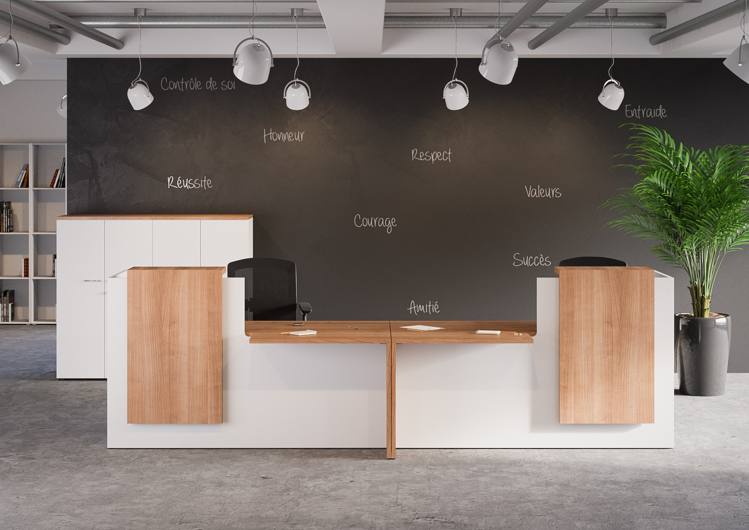 La banque d’accueil FIFTY-FIFTY est composée de panneau structurex de 25mm d’épaisseur, de chant ABS anti-choc de 2mm.